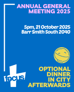 A chance to give thanks to God for the last 12 months at FOCUS, elect our new student committee and do some important house keeping for being a club affiliated with YouX and AFES.